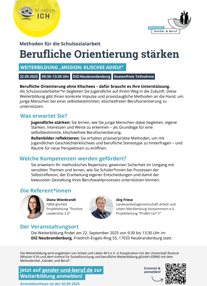 Am 22.09.2025 fand in Kooperation mit dem ISBW der Workshop „Mission: Klischee adieu!“ für Schulsozialarbeiter:innen in Neubrandenburg statt.